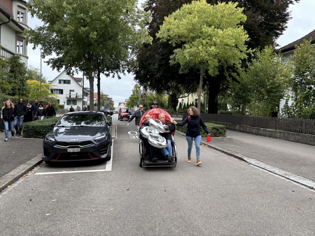 Die gemeinsame Reise am Jubiläumstag begann für alle Mitarbeitenden vor dem Firmensitz, wo auf die drei Jubilare Daniela Rettenbacher, Gianfranco Merella und Francesco Caldarola eine geschmückte Rikscha wartete. 20-Jahre-Jubilar Francesco Caldarola gebührte die Ehre, in die Pedale des Gefährts zu treten und seine Arbeitskollegin und den -kollegen sicher zur Feier-Location zu befördern.