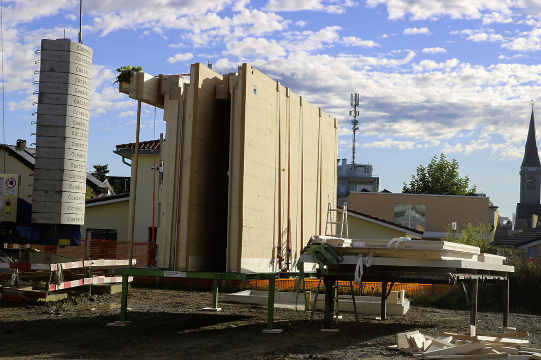 02.10.2025 Schule&Bildung, RomanshornEs geht sichtbar weiter: Hier wird die Holzkonstruktion für das Erdgeschoss aufgerichtet, dann folgt der erste Stock.