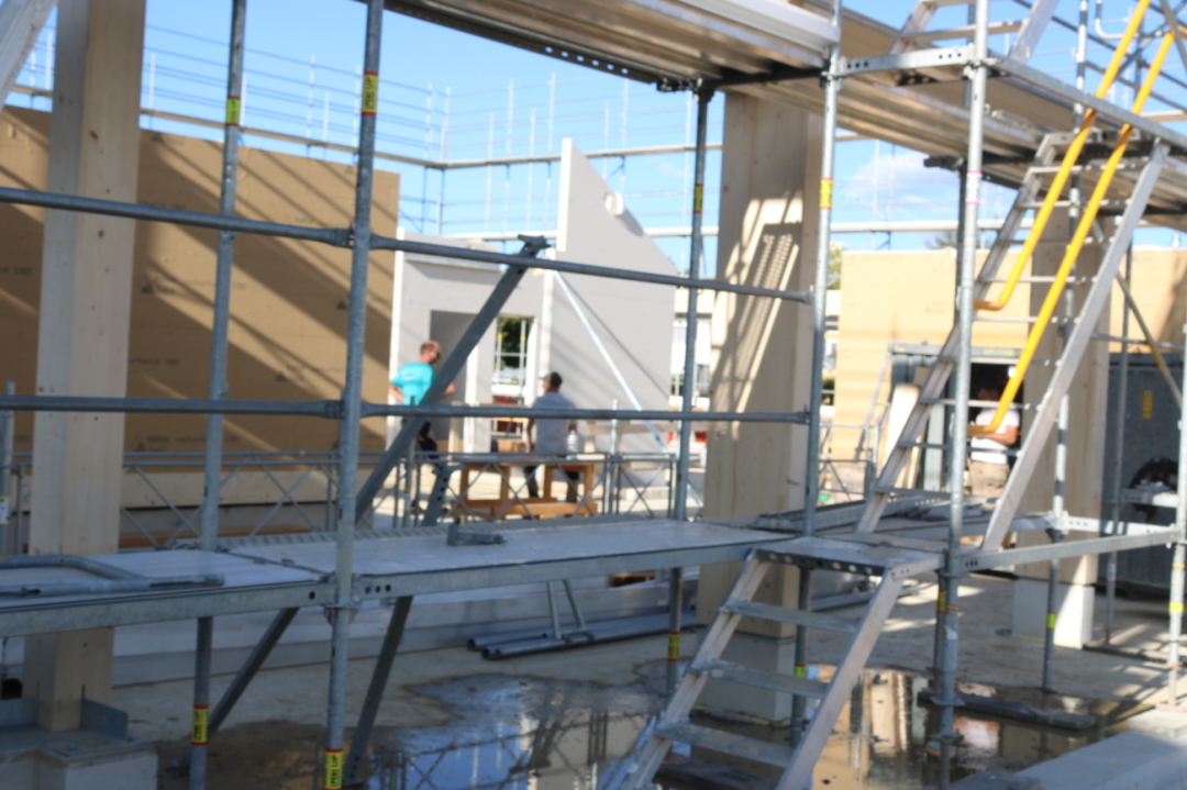 Es geht sichtbar weiter: Hier wird die Holzkonstruktion für das Erdgeschoss aufgerichtet, dann folgt der erste Stock.