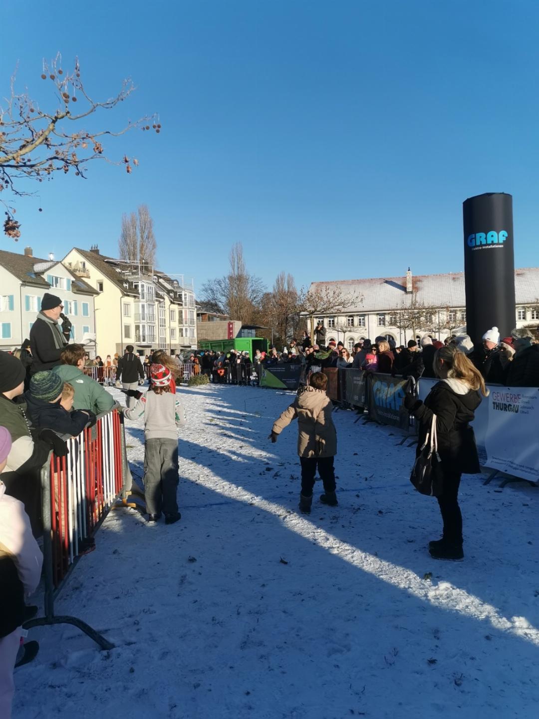 Strahlender Sonnenschein lockte trotz der grossen Kälte viele Leute an den See. An den Kiwanis-Ständen wärmten sich etliche bei Glühwein, Bratwurst oder Kuchen auf. Remo Bischof vom Gewerbeverein forderte den ersten Teilnehmer zum Werfen auf. Es gab verschiedene Kategorien: Bäume unter und über 1,50 Meter und für Kinder Adventskränze.