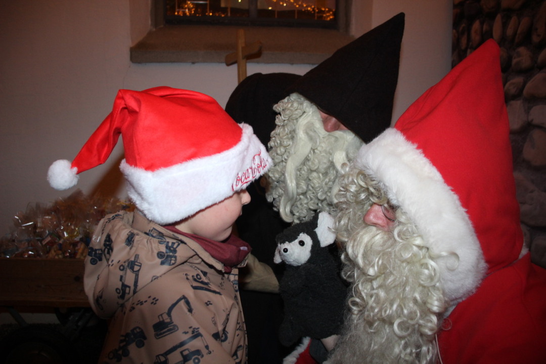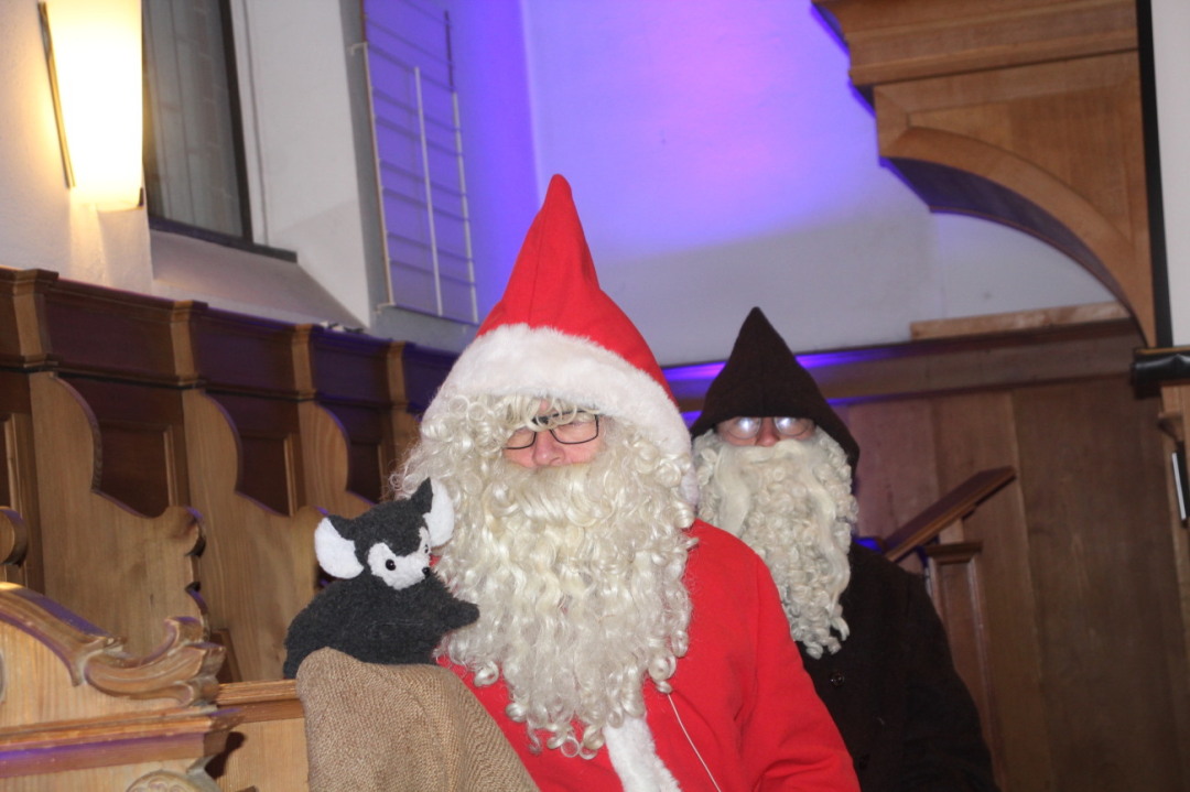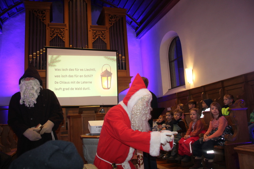 Mutige Kinder nahmen auf den Bänken beim Altar vorne Platz und alle sangen mit: «Was isch das für es Liechtli», «Zimetstärn hani gern». Der Samichlaus öffnete den Sack und wollte ein paar Nüssli verteilen. Doch beim Griff in den Sack erwischte er nur Erdnuss- und Manderinlischale. Ganz zuunterst stiess er auf etwas Lebendiges. Frederik, die Maus von Samichlaus und Schmutzli, hatte sich im Sack versteckt und Nüssli geknabbert. Frederik weigerte sich, bei den Kindern um Entschuldigung zu bitten.