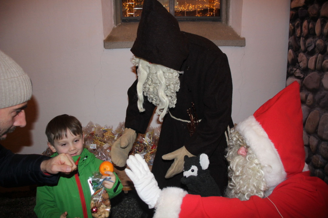 Schliesslich erzählte Diakon Stefan Maag eine Tiergeschichte, in der es um gemachte Fehler und Entschuldigung ging. Zögernd liess sich auch Frederik dazu bringen, sich zu entschuldigen für die Nüssli, die er den Kindern weggegessen hatte. Während der ganzen Feier hockte er auf der Schulter des Chlauses und guckte frech in der Gegend umher.