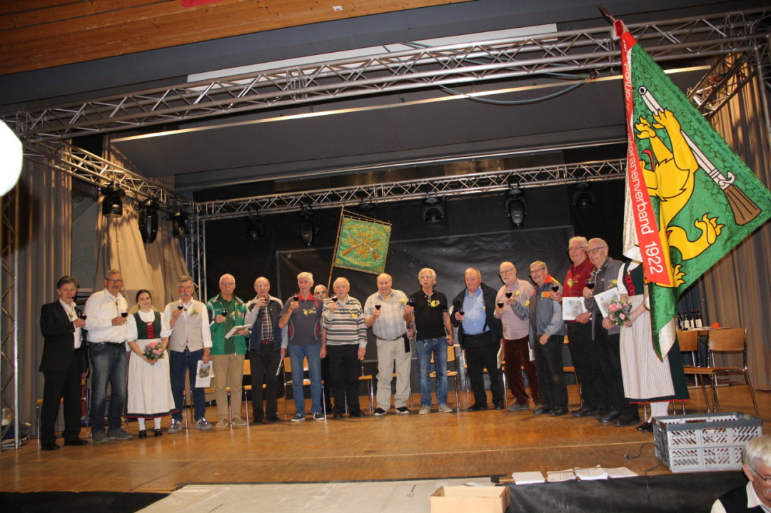 Besonders feierlich wurde es, als die 19 neuen Ehrenveteranen auf die Bühne gebeten wurden und von den Ehrendamen die Goldzweige angesteckt bekamen. Beim Absenden konnten die Jahresmeister der Kategorien Geschenkkörbe und Pins entgegennehmen.