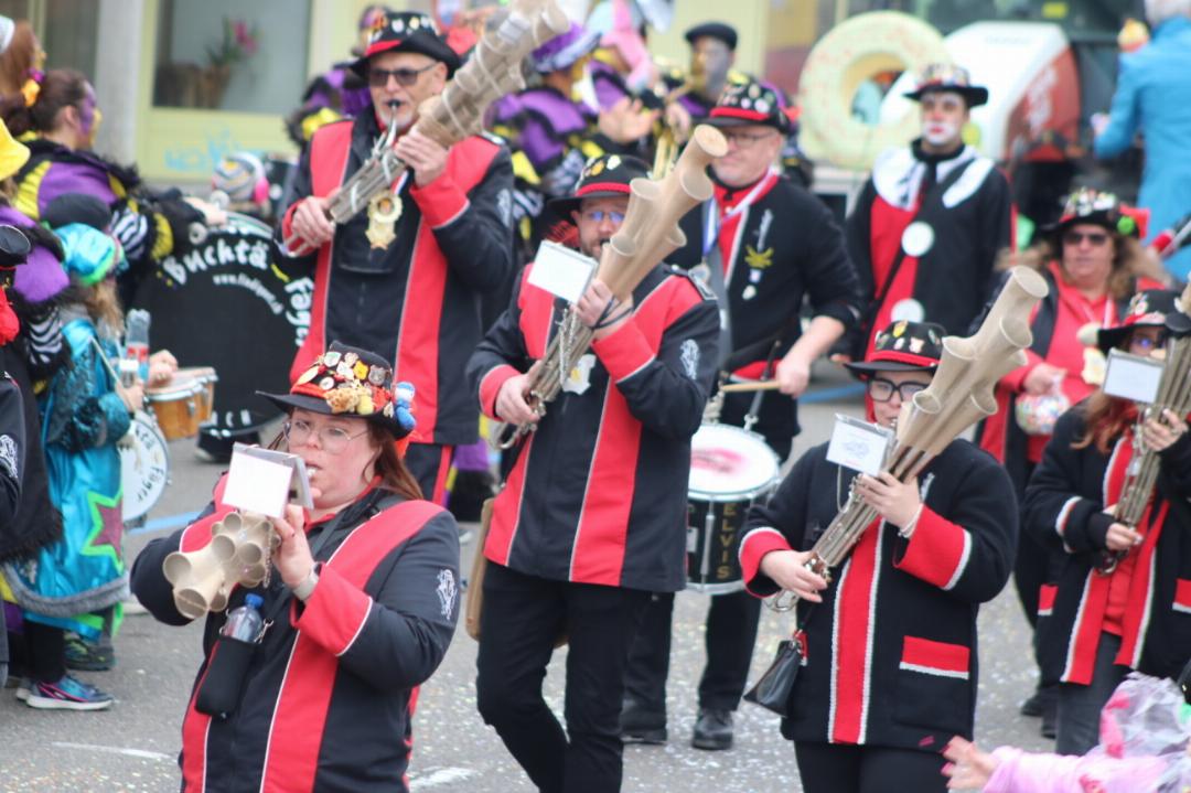 Beim Coop startend führt der farbenfrohe Umzug über die Alleestrasse–Bahnhofstrasse–Hueber Rebgarten zum Festplatz beim gedeckten Parkplatz des Hubzelgs. Zwanzig Gruppen von nah und fern bilden diesen heiteren, musizierenden und lachenden Tatzelwurm, bestehend aus Hexen, Guggen, Grafen, Masken oder Tierfiguren. Dieses Jahr beehren beispielsweise die «Trotte-Müetterli» mit ihren Holzmasken und die «Narrhalla Reichenburg» unsere Hafenstadt. Beide Gruppen kommen aus der Fasnachtshochburg im Kanton Schwyz. Aber auch die Igelkinder des Kindergartens Im Grund oder die «Flosschaoten» sind mit dabei.