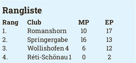 Am 17. Januar fungierte Romanshorn als Heimteam. Für die Mannschaft standen Jan Kammerlander, Elia Kammerlander, Julian Hefti, Elias Lüscher sowie Canar Balta an den beiden Turniertagen am Schachbrett.