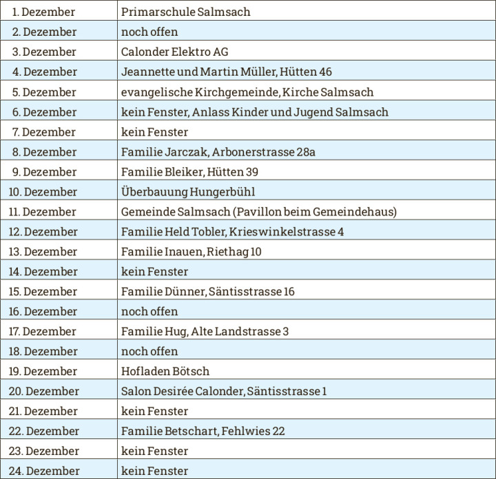 20.11.2025 Kultur&Natur, SalmsachFolgende Familien / Firmen öffnen jeweils um 18 Uhr ihr Adventsfenster in Salmsach und freuen sich auf viele Besucher. Teilweise wird ein Umtrunk offeriert. «Geniessen Sie bei einem vorweihnachtlichen Abendspaziergang die fantasievoll gestalteten Fenster oder Vorplätze und nutzen Sie die Gelegenheit für einen Schwatz mit anderen Salmsacherinnen und Salmsachern.»