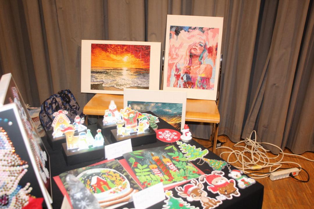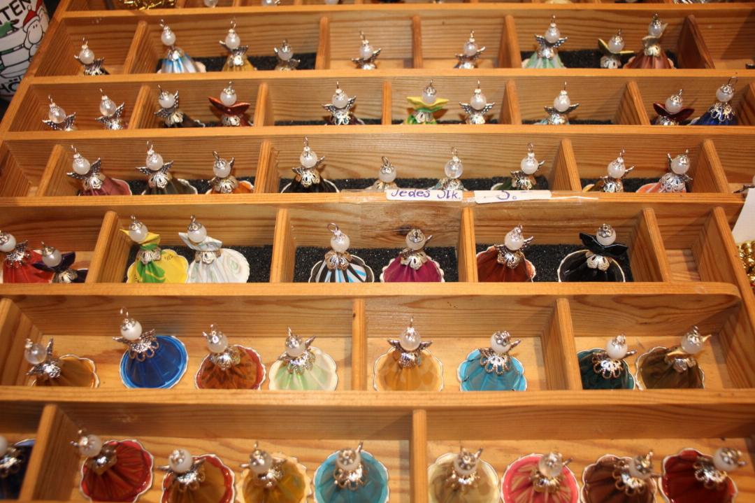 Bilder aus Bügelperlen und Diamantsteinen, Häkelkleinode, Kunstwerke aus Glas und Winterschmuck aus allerlei Grünzeug und bunten Kugeln. Selbst gemachte Konfitüren, Weihnachtschutneys, gebrannte Mandeln, Quittenlikör und andere liebevoll verpackte Delikatessen boten sich an als Mitbringsel.